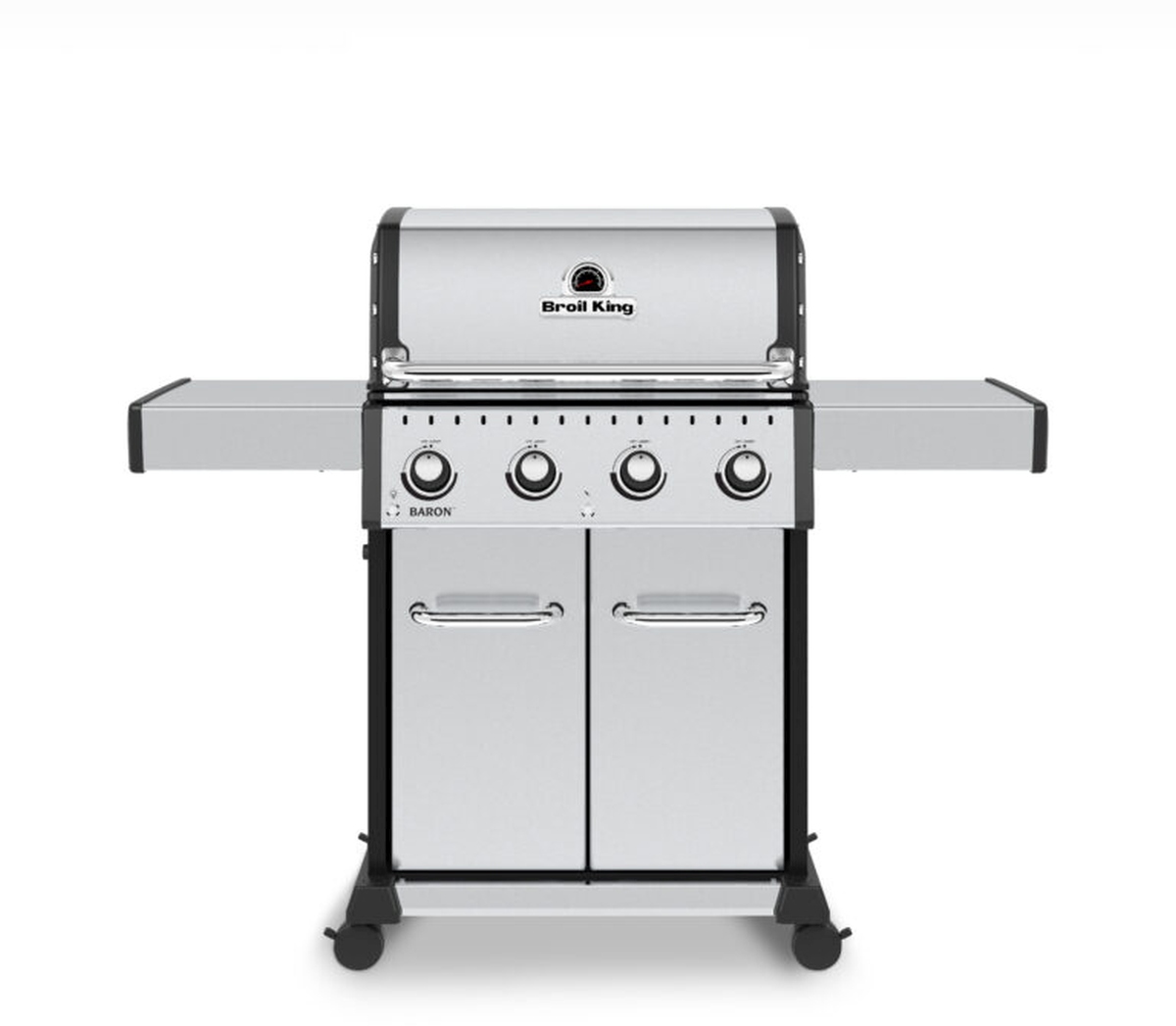 The Baron™ S 420 PRO features a 460 sq. in. primary cooking surface and includes a durable cast aluminum oven, 4 stainless steel Dual-Tube™ burners, illuminated control panel lights, stainless steel Flav-R-Wave™ cooking system, and electronic ignition. All 400 PRO series include stainless steel 8 mm rod cooking grids, stainless steel warming rack, stainless steel drop-down side shelves, and an enclosed black cabinet base.