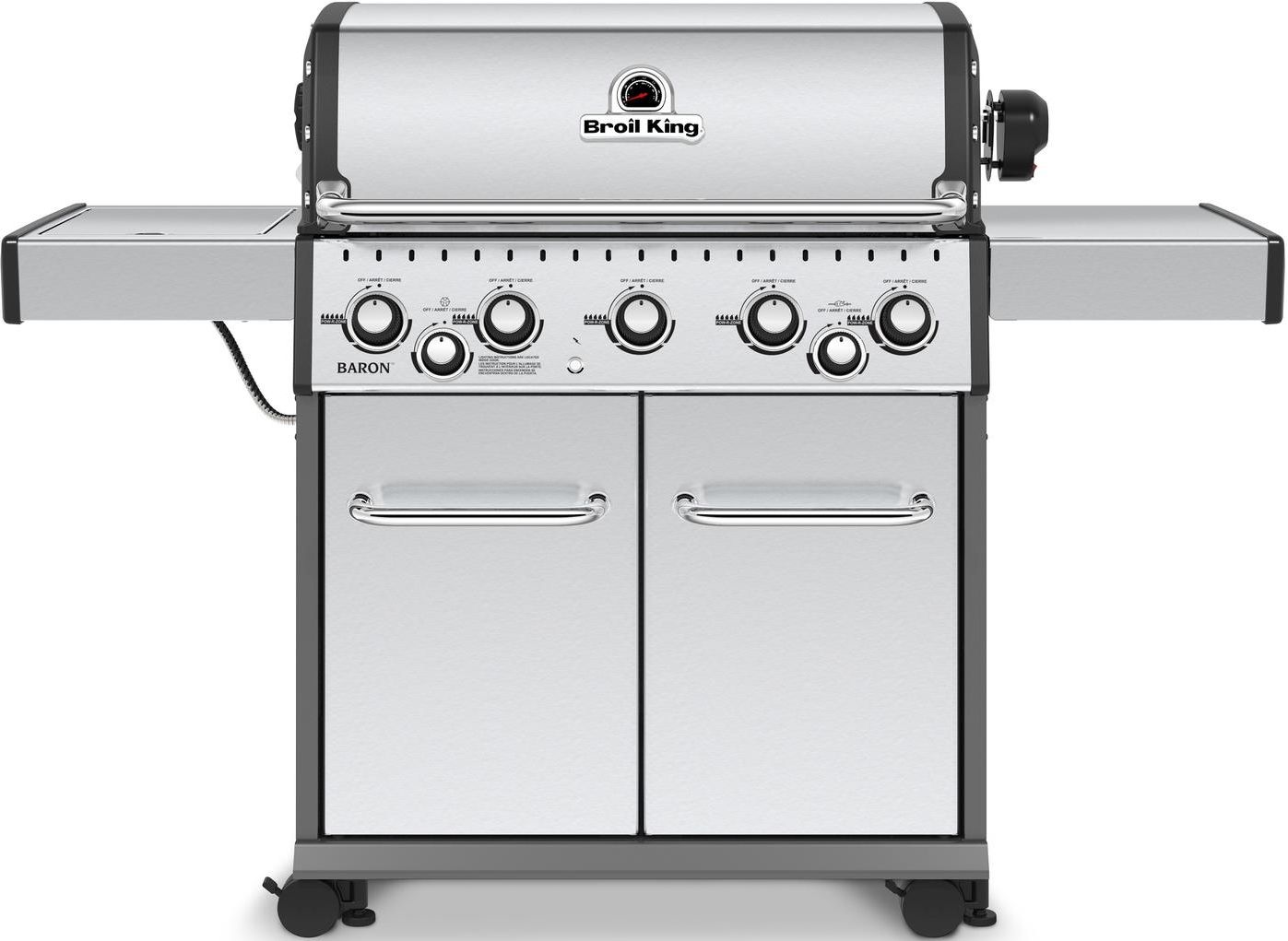 Baron™ S590 features 805 sq. in. total cooking space including porcelain coated warming rack, reversible heavy-duty cast iron cooking grids, stainless steel Flav-R-Wave™ cooking system, 5 stainless steel Dual-Tube™ burners, and stainless steel drop-down side shelves and an enclosed cabinet base. The power infrared side burner has a solid 9 mm stainless steel cooking grid and aluminium body.