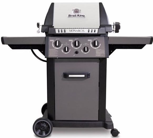 Monarch Series features 330 Square in. primary cooking surface, reversible heavy-duty cast iron cooking grids,stainless steel Flav-R-Wave cooking system, 3 stainless steel Dual-Tube burners, Sure-Lite ignition system,painted steel drop-down side shelves, and enclosed cabinet base.