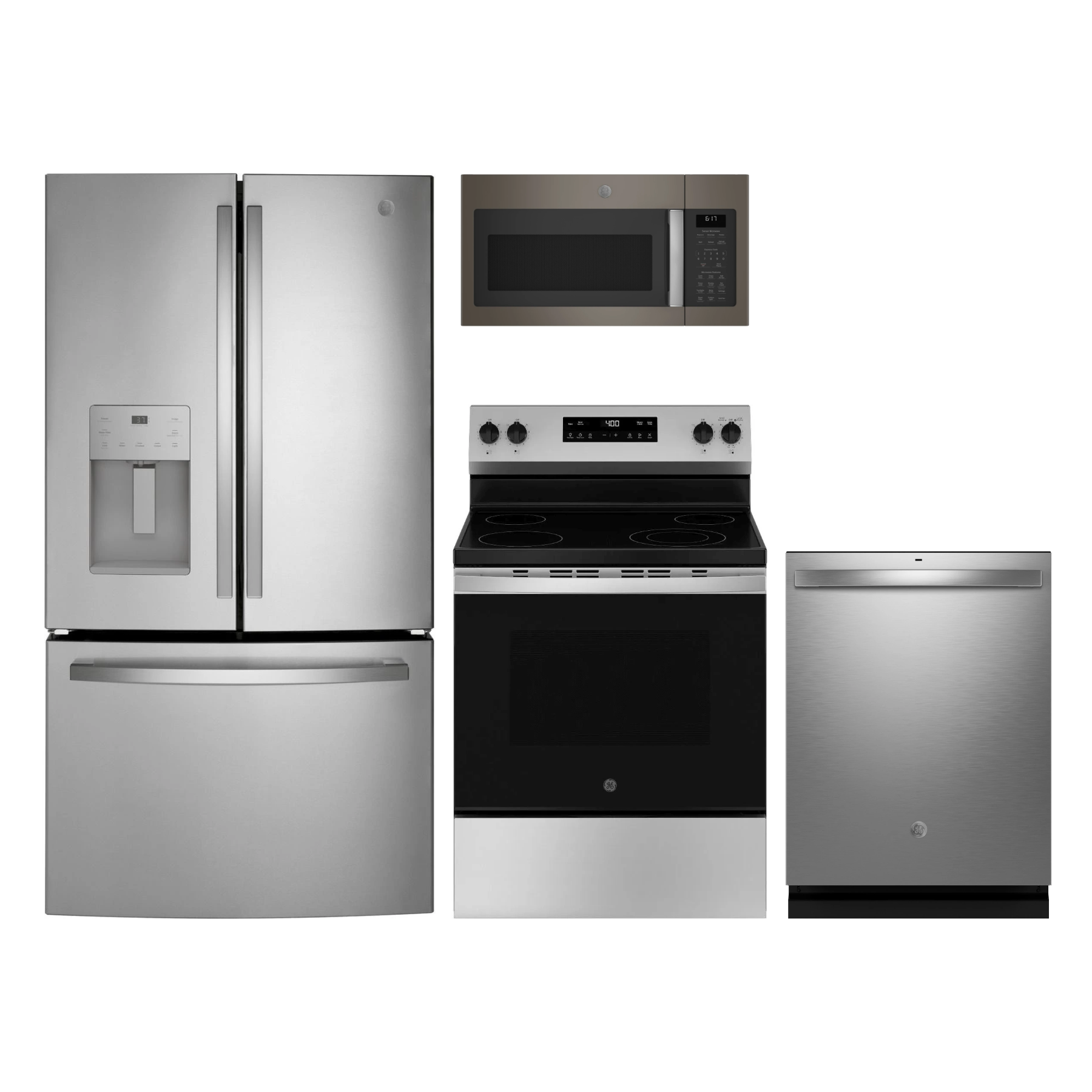 GE® 4 Piece Stainless Steel Kitchen Package with french door refrigerator, freestanding electric range, built in dishwasher and over the range microwave.Read More