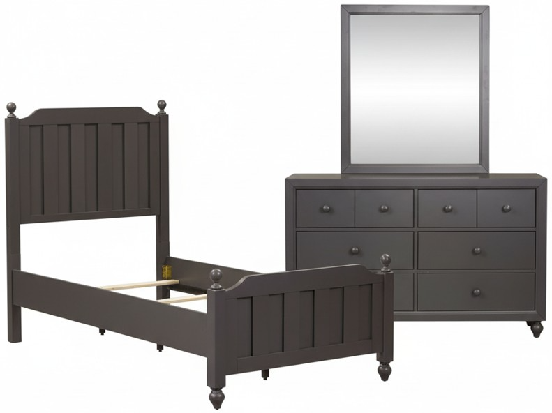 Bring in clean lines with the Cottage View twin panel bed, dresser, and mirror. Crafted of melamine and rubberwood solids, this kit features a dark gray finish, picture frame solid wood case moldings, bun feet, bluff-cut top drawers, and is accented with wooden knob hardware.Read More