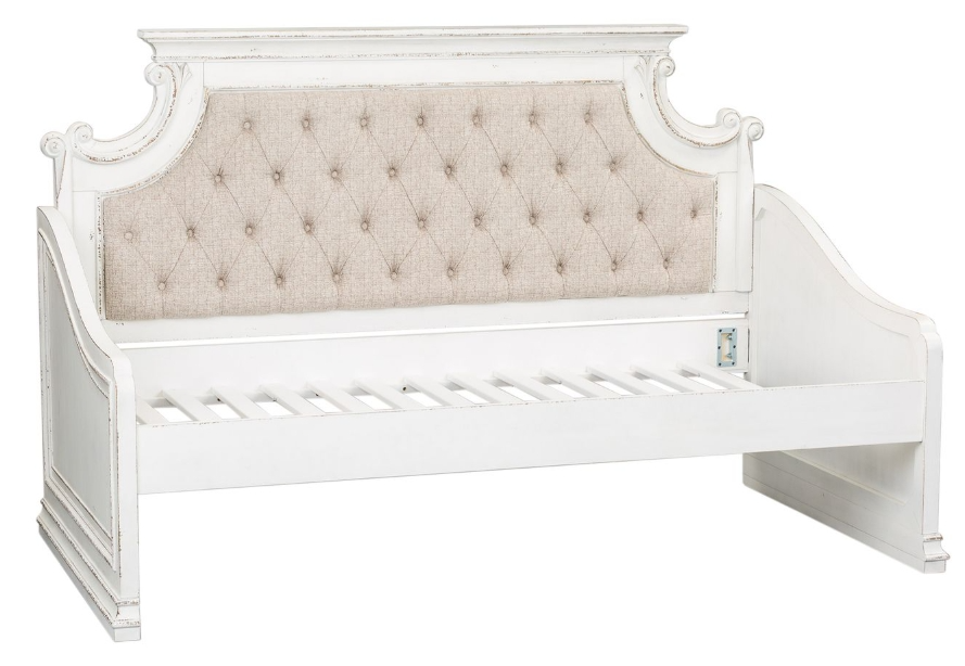 Accent your bedroom with the perfect blend of European Traditional design, using this unique twin daybed. Upholstered in tufted chenille, laced with tones of white, tan and brown threading, this bed constructed with poplar solids as well as oak & birch veneers, features an antiqued white finish accompanied by heavy chipping.Read More