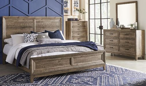 The panel bed features a headboard and footboard in a two-panel picture frame style, hook-on rails, and a center support slat system. The dresser has six drawers and pairs well with the mirror with a beveled edge and included bolt-on supports. The chest offers an additional five drawers of storage. Ridgecrest is the essence of urban living furniture with its unique ability to fit many styles, from rustic to casual to contemporary.