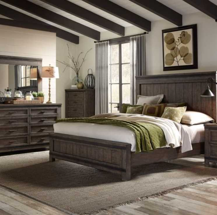 Enhance your home with the Thornwood Hills California king panel bed, dresser, mirror, and chest. Crafted of rubberwood solids with mango veneers, this kit features a rock-beaten grey finish with saw cuts. Add this unique bedroom set to your traditional style home.Read More