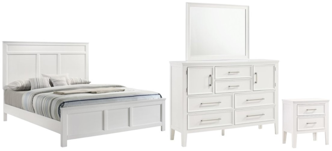 The Andover collection in white brings a touch of timeless elegance to your bedroom with its stunning blend of modern design and classic craftsmanship. This set includes a panel bed, dresser, mirror and nightstand, all expertly crafted from solid rubberwood, manufactured woods, and wood veneers to ensure long-lasting durability and beauty.Read More