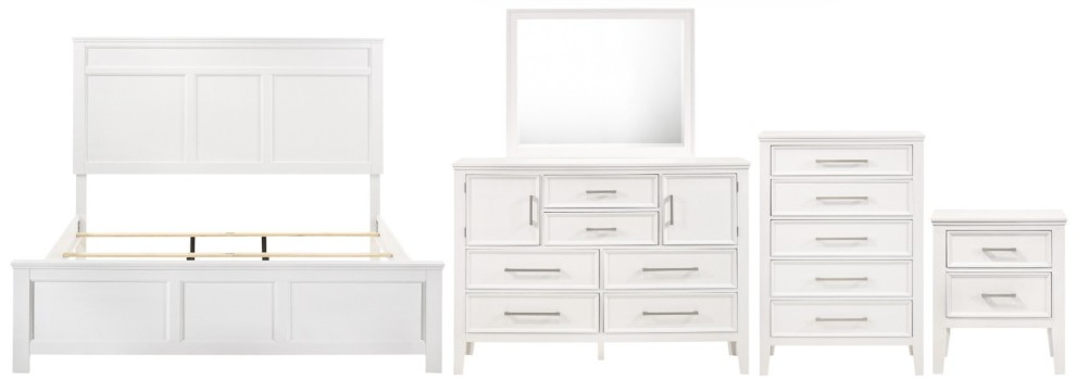 The Andover collection in white brings a touch of timeless elegance to your bedroom with its stunning blend of modern design and classic craftsmanship. This complete suite includes a panel bed, dresser, mirror, nightstand, and chest, all expertly crafted from solid rubberwood, manufactured woods, and wood veneers to ensure long-lasting durability and beauty.Read More