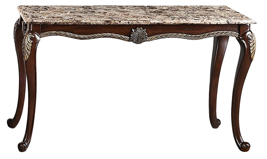 Sophisticated Touches: The marble top features a rich blend of deep brown tones with intricate white and beige veining patterns running throughout. The swirling pattern creates a luxurious and dynamic appearance.. The combination of the dark, earthy hues with lighter streaks offers a striking contrast that complements the ornate wooden base, adding a touch of sophistication and timeless beauty to the piece.