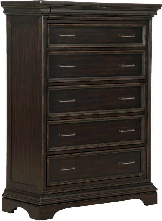 Finish: Traditional deep brown finish works with any bedroom color palette and has gentle distressing for a time-honored appearance. Antique brass finished pulls.