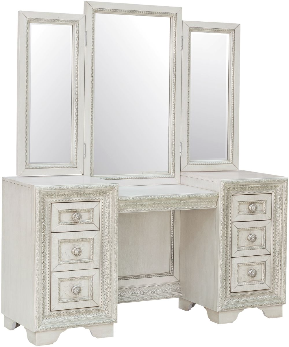 Camila adds a touch of glamour with this seven drawer vanity and the beautiful trifold mirror. Pulaski uses carefully chosen solid wood and select wood veneers over durable wood products in our furniture construction.Read More