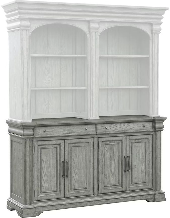 There is an adjustable shelf behind each pair of doors where you can stow larger items. Pilaster detailing, moldings and bracket feet add architectural detail, while the buff gray finish and oak veneers give it a relaxed, casual attitude. It can be used on its own, or with the impressive coordinated hutch, which is sold separately.